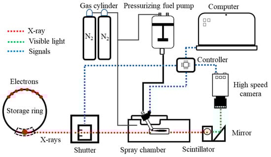 The experiment setup is illustrated in Figure 2. Electrons circled in a storage ring under the guidance of insertion devices, i.e., different types of magnets. Whenever the electron-traveling path was changed, the electron emitted an X-ray beam along the tangent direction. The emitted X-ray beam was repositioned and refocused through a sophisticated setup of optic lenses and finally entered the experiment hutch for measuring uses. When the X-ray beam passed through the objective, a phase-contrast image was formed, which was converted using a scintillator crystal (LuAg:Ce) to visible lights. The synchrotron revolution frequency is 271 kHz. The higher the image rate, the smaller the image view field becomes. As a result, the high-speed camera used a reduced frequency signal as the triggering signal, i.e., once every four revolutions of the synchrotron. In addition, a mechanical chopper was placed upstream of the experiment system. This chopper enabled the X-ray to pass through only at the imaging instant. Otherwise, the scintillator crystal and camera could be damaged due to the heavy heat load of the X-ray. The converted visible-light image was recorded by the high-speed camera (Model SA-Z, Photron Inc., Tokyo, Japan). Several digital delay generators were used to synchronize the fuel injection and the timing of the incoming X-ray beam and the high-speed camera start-recording trigger. The view field of the images was 1.1 mm×1.1 mm, and the spatial resolution of the images was 2.5 μm/pixel.