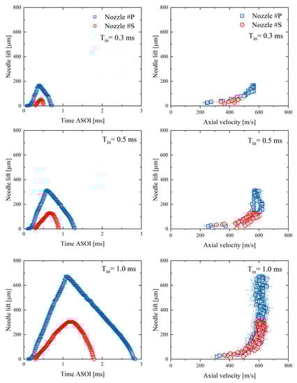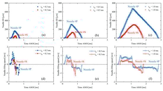 Nozzle #P and Nozzle #S have identical nozzle holes and sac geometry but different needle motion profiles. More specifically, Nozzle #P has a faster needle opening and slower needle closing compared to Nozzle #S. Regarding the mechanism of why Nozzle #P, i.e., the faster needle valve opening tends to cause a larger spray spreading angle and faster velocity decay along the spray axis at the low needle lifts, a detailed simulation might be needed in the future. However, as a simplified analysis, the near-nozzle spray dynamics are typically regarded to rely on the nozzle internal flow characteristics. Second, the internal flow turbulence mainly relates to the flow momentum inside the nozzle sac, which further links to the time gradient of the sac pressure change [,]. Then, the time gradient of sac pressure change can be correlated with the needle lift using Equation (3),