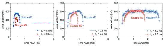 The effect of needle motion profiles on the near-nozzle spray dynamics will be examined in this section. First, Figure 4 shows the time-sequence results of spray center velocities, measured at 1.5 mm from the nozzle-hole exit. The time-sequence velocity profiles are approximately rectangular. The spray velocities in Nozzle #P appear earlier than in Nozzle #S. This is understandable due to its earlier needle valve opening, as shown in Figure 3. The velocity amplitude slightly increases with the extending injection pulse width. This phenomenon is particularly apparent in Nozzle #S. The nozzle-exit spray velocity is well known to primarily rely on the pressure differential across the nozzle hole [,]. Since the ambient gas pressure was kept constant in this investigation, the higher the sac pressure, the larger the spray axial velocity can reach. Therefore, the results in Figure 4 indicate that the sac pressure in Nozzle #S is still increasing when the injection pulse sets 0.3 ms and 0.5 ms. Once the fuel flow entering the sac and leaving from the nozzle holes reaches balance, the sac pressure will be stabilized, i.e., reaching a steady state. As a result, the spray velocity at the nozzle exit should also keep constant. The results in Figure 4 reveal that the sac pressure in Nozzle #P reaches a steady state earlier than in Nozzle #S. After reaching the steady state, the spray center velocities of Nozzle #P and Nozzle #S are almost identical.
