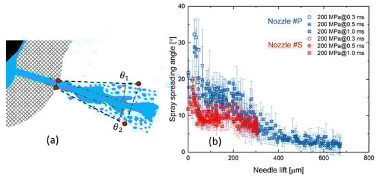 Figure 7b shows the results of the spray spreading angle. It is seen that the spreading angle of Nozzle #P is 42% larger than Nozzle #S within a needle lift ranging from 0 µm to 200 µm, approximately. When the needle lift exceeds 200 µm, the spreading angles of the two nozzles become identical. As mentioned above, the spray spreading angle mainly depends on the internal flow because the current spreading angle was measured at 1.5 mm from the nozzle exit. At such a distance, the aerodynamics should not have been effective yet. Therefore, the results shown in Figure 7b reveal that a higher degree of flow turbulence exists in Nozzle #P compared to Nozzle #S at the low needle lifts. However, the flow turbulence in both nozzles will become identical at the high needle lifts.