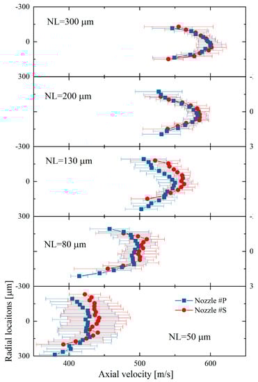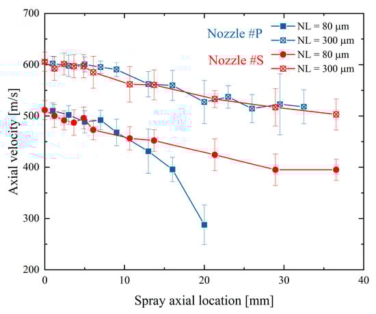 Figure 10 shows spray velocity evolutions along the spray axis. The results of the needle lifts of 80 and 300 µm under an injection pulse width of 1.0 ms were illustrated only as an example. The spray velocity of Nozzle #P declines rapidly along the spray axis at the 80 µm needle lift. In contrast, the spray velocities along the spray axis of Nozzle #P and Nozzle #S have become identical at the needle lift of 300 µm. This result is consistent with the results in the previous sections, showing that Nozzle #P and Nozzle #S have similar spray center velocities and spray spreading angles at the high needle lifts. Therefore, it is understandable that these two nozzles have an identical velocity distribution along the spray axis. It is worth noting that the spray velocity of Nozzle #S increases with the increasing needle lift, whereas the velocity declination rate along the spray axis is almost unchanged. Therefore, it is considered that Nozzle #S should have less flow turbulence inside the nozzle regardless of the needle lift because, as shown in Figure 7b, the spray spreading angles of Nozzle #S are similar at the needle lift of 80 µm and 300 µm. As such, the change in spray velocity is mainly related to the pressure increase in the nozzle sac.