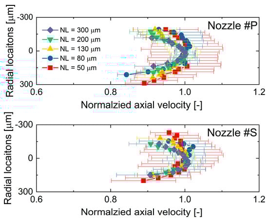 In Figure 8, it is seen that the spray velocity gradually increases with the lifting needle valve. To compare the velocity distribution at different needle lifts, the spray velocities () were normalized by the spray center velocity () at each needle lift, as shown in Equation (2).