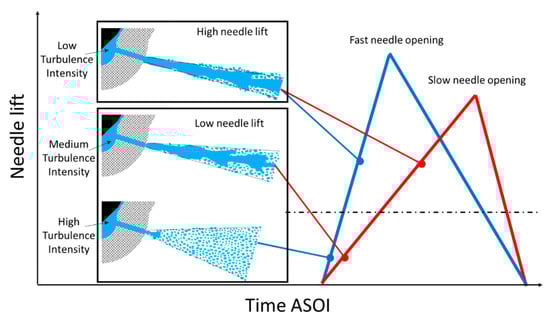 where and are the sac pressure and needle lift, respectively. stands for the needle valve opening speed. It can be known from Equation (2) that the faster the needle valve opens, the larger the time gradient of the sac pressure change is. Therefore, it is reasonable that a faster needle opening can result in more flow turbulence. On the other hand, the spray velocity also depends on the absolute sac pressure. Once the sac pressure reaches a balance, i.e., being identical to the common rail pressure, the time gradient of the sac pressure will not change anymore. Therefore, the flow turbulence in the nozzle significantly reduces, making the spray dynamics irrelevant to the needle valve opening speed and the height of the needle lift.