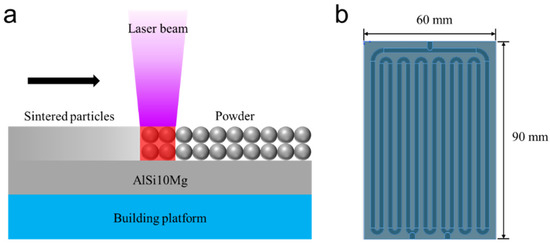 A metal 3D printer (EOS M290) was employed to fabricate the container of the aluminum flat-plate OHP. AlSi10Mg particles with a diameter of about 20 µm were used as the raw materials. Figure 1a shows the fabrication process of the flat-plate OHP using a 3D printing technology. Firstly, a thin layer of AlSi10Mg powder was evenly spread on the building platform. Then, a high-power laser was turned on and melted and fused the specific part of the powder layer. After the melted part solidified, the building platform would move down from a slight distance, and the surface was covered with another AlSi10Mg powder layer by using a recoater. The high-power laser continuously and selectively melted the specific part of this new powder layer. Through the layer-by-layer process, the aluminum powder was finally built to the shape of the desired sample. During the whole process, Ar was severed as a protective gas to avoid the oxidation of the sintered aluminum particles.