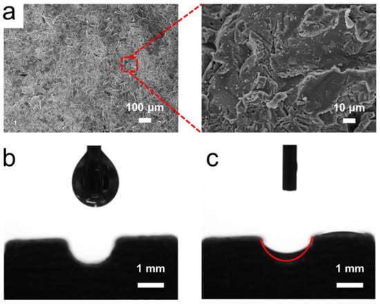 In order to characterize the wettability of the inner surface in the 3D-printed flat-plate OHP, we cut the pipe in half lengthwise. Figure 3a shows the micromorphology of the inner surface of the 3D-printed flat-plate OHP with different magnifications, which were characterized by scanning electron microscopy (SEM). As shown, the 3D-printed flat-plate OHP had a rough inner surface, and numerous granular bulges were distributed on the surface. Such structure was attributed to the selective laser melting technology, which melted and fused aluminum powders by a high-power laser. The sintered aluminum powders formed such a rough surface.