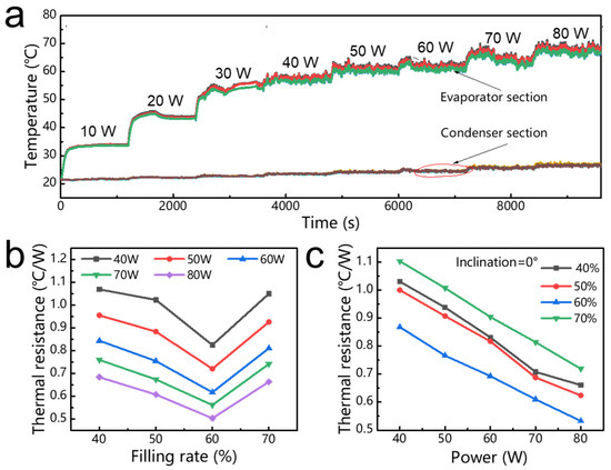 To further verify the application in practice, we evaluated the heat transfer capability of the 3D-printed flat-plate OHP when it was horizontally placed to eliminate the effect of gravity. Figure 4c presents the variation in the thermal resistance of a 3D-printed flat-plate OHP with a 60% filling ratio in the horizontal operation mode. As shown, when the filling ratio of the flat-plate OHP was 60%, the thermal resistance was gradually decreased as the input power increased from 40 W to 80 W. In addition, it was obvious that when the input heating power was increased from 40 W to 80 W, the 3D-printed flat-plate OHP presented a good thermal performance and low thermal resistance regardless of whether it was in the vertical or horizontal operation modes.