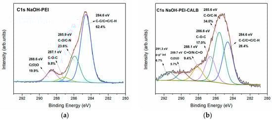 In order to investigate the surface modification of the 3D-printed PLA structures before and after enzyme grafting, XPS analysis was performed. Figure 2 shows the high-resolution C1s photoelectron spectra of (a) NaOH-PEI, and (b) NaOH-PEI-CALB. The fitted peaks reveal the characteristic bonds on the surface of the modified 3D-printed structures before and after the enzyme immobilization. In Figure 2a the four fitted peaks are attributed to C-C/C=C/C-H bonds at 284.6 eV, C-O and C-N bonds at 285.9 eV, C-O-C at 287.1 eV, and carboxylic bonds centered at 288.6 eV. All these functionalities are ascribed to the surface of the reduced surface of PLA after treatment with NaOH, as stated in our previous work [], and the PEI moieties that have been deposited on the surface. The carbon spectrum after the enzyme immobilization changes significantly, and this is compelling evidence of the successful interaction of the enzyme and the surface. The C-N peak centered at 285.6 eV (Figure 2b) increases due to the amine-rich environment of the enzyme on the surface. A new peak revealed at 288.1 eV provides proof of the covalent immobilization by which the enzyme interacts with the amine groups of the PEI []. It is noteworthy that the newly fitted peaks revealed at high energy levels (291.3 eV) may derive from some p-p* electrostatic interactions between adjacent enzymes.