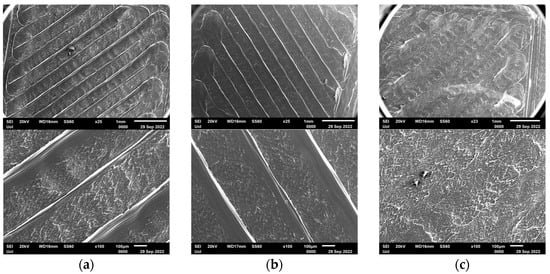 SEM micrographs of modified PLA structures. (a) modified PLA, (b) modified PLA incubated in 100% DES for 2 h, (c) modified PLA incubated in 100% DES for 24 h.