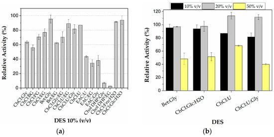 The activity of the immobilized CALB on PLA multi-well plates was initially screened at various DES-buffer solutions in which the concentration of each DES was 10% v/v. As can be seen in Figure 4a, the activity of the enzyme depended on the DES used. Specifically, among the DESs whose HBA is ChCl, the best activity was observed in the case of the DESs ChCl:Fru:H2O (92%) and ChCl:Glc:H2O (94%), and among the DESs that contain Urea as HBD, ChCl:U (87%), ChCl:U:EG (89%), and ChCl:U:Gly (82%). The activity of the immobilized lipase in the aqueous solutions that contain DESs whose HBDs are alcohols was lower (56–77%). Concerning the DESs Bet:Gly and Bet:EG, the enzyme activity was found to be the highest in the presence of Bet: Gly (95%) and was similar to the activity that was observed in the case of the ChCl-based DESs that contain sugars (92% and 94%). Furthermore, the enzyme activity was even lower in the presence of 10% v/v EAC-based DESs (35–43%) and even more decreased in the presence of Chol DHP-based DESs (3–7%).