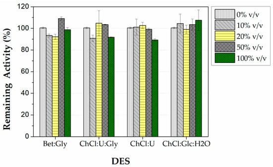 The stability of the immobilized CALB was examined in buffer (0% v/v DES) and different concentrations (10, 20, 50, and 100% v/v) of the four selected DESs. The remaining enzymatic activities after 1h incubation at 40 °C are shown in Figure 5. In general, the remaining activity of the immobilized enzyme was ≥90% in all concentrations of DESs tested, indicating that these selected solvents did not destabilize the immobilized lipase. More specifically, in the low-to-medium concentrations of the U-based DESs (10–50% v/v), the remaining activity was up to 105%, showing a slight enzyme activation. It is interesting to note that even at 100% v/v concentration of U-based DESs the immobilized enzyme retained 90% of its initial activity. A significant stabilizing effect was also observed in the case of a high concentration of Bet:Gly, and especially in ChCl:Glc:H2O, where no significant loss of activity was observed at any concentration, demonstrating the protective role of these sugar-based DESs. This stabilizing effect of these DES is similar to that observed for other lipase preparations [,,].