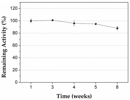 The storage stability of the immobilized system was evaluated for up to 2 months of storage at 4 °C. The enzyme activity was determined as described in Section 2.3 and wells were washed thrice with phosphate buffer and dried under a N2 stream for 30 s. Subsequently, the enzymatic activity of the immobilized CALB was measured after 1, 3, 4, 5, and 8 weeks of storage, and the remaining activity was estimated. Measurements were conducted in triplicate.