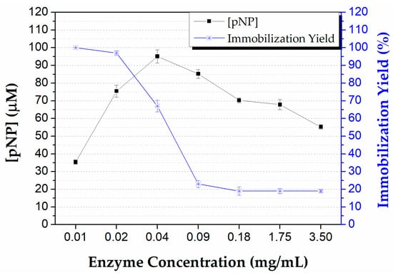 Effect of enzyme concentration on the microreactor’s biocatalytic performance and immobilization yield. Reaction conditions: 0.25 mM pNPB in 50 mM phosphate buffer pH 7.5, 40 °C, flow rate 300 μL/min (tR = 30 s).