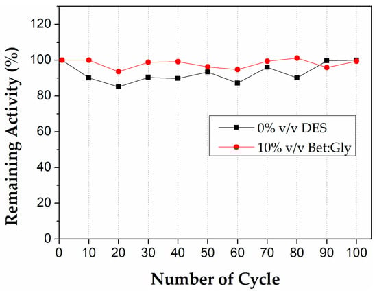 The biocatalytic microreactor system was evaluated in terms of its operational stability by performing 100 successive cycles of use, in the absence or the presence of 10% v/v Bet:Gly. The hydrolysis of pNPB was used as the model reaction and each cycle was deemed when the whole microreactor volume (150 μL) passed through the microreactor. As presented in Figure 8, the immobilized CALB in PLA microreactor retained its initial activity at 100% after 55 min of continuous use in both 0% and 10% v/v Bet:Gly. This suggests that the presence of DES did not affect the operational stability of the biocatalyst, thus rendering its use feasible in long-lasting hydrolysis reactions. The remarkable operational stability of immobilized enzymes in microreactor systems has been previously reported both for hydrolytic and synthetic bioprocesses, suggesting the potential of microfluidic systems in terms of process efficiency and sustainability [,,].