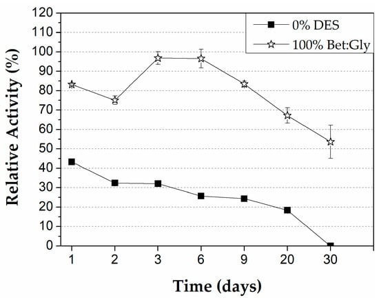 The robustness of the enzymatically modified PLA microreactor was also tested by filling the microreactor with 100% Bet:Gly and incubating at 60 °C. In this manner, the stability of the immobilized lipase would be evaluated, and insight would be gained into the capability of the microbioreactor to be used in synthetic reactions that include this DES. So, at specific points in time, the DES was removed, the microbioreactor was washed and dried and the activity of the lipase was measured. The results regarding the stability of the immobilized CALB in the PLA microreactor for a period of one month are presented in Figure 9. In the case of the incubation in DES, the lipase demonstrated great stability, as it retained more than 50% of its initial activity after one month compared to the control, where the microreactor was fulfilled with buffer and the activity of CALB was diminished. These results give prominence to the stabilizing effect that betaine-based DES has on the protein molecules. The stabilizing effect of Bet:Gly on free CALB has also been reported elsewhere []. A possible explanation for the enzyme stabilization that some DESs offer at elevated temperatures could be that the hydrogen bonding of the DES’s ingredients helps to maintain the enzymatic structure by absorbing the heat of the medium and thus, the enzyme molecules do not get dehydrated [].