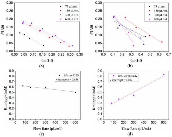 However, when 10% v/v Bet:Gly is added to the system, its kinetic behavior alters significantly. In this case, an increase in the slopes of the lines (Figure 10b,d) is observed with increasing flow rate indicating mass transfer effects. However, moving from the lowest to the highest flow rates tested, only a 2.6-fold increase in the Km(app) values are observed, proving that the mass transfer effects are not considered strong [,]. The Km(app) for zero flow rate in this case (0.206 mM) is lower than that observed for the free enzyme form (0.392 mM), indicating more effective substrate accessibility in the immobilized enzyme acting in a DES-based system. Such an observation has been previously reported for immobilized enzyme microreactors and is indicative of the increased stabilization of the biocatalyst along with the more effective substrate diffusion within the system [,].
