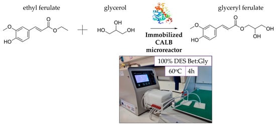 Glyceryl ferulate (GF) is a natural compound widely distributed among the plant kingdom that is especially known for its antioxidant and UV light-absorbing properties []. However, its isolation from natural sources is limited, so the de novo synthesis methods through esterification and transesterification reactions have been proposed [,]. Herein, the transesterification reaction of ethyl ferulate with glycerol towards the synthesis of GF (Figure 11) is demonstrated for the first time in a continuous flow microreactor system, elaborating Bet:Gly as a novel, green reaction solvent, that could play a double role as a solvent component and a reaction substrate at the same time (the 2-in-1 concept). The transesterification reaction was also performed in batch reaction systems. Free CALB and commercially immobilized CALB (Novozym 435) were used under the same reaction conditions and the productivity of the different systems is presented in Table 4.