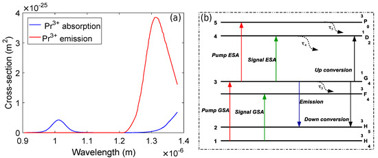 It is evident from Figure 1a that Pr has two pump absorption bands with their peaks centered at 1010 nm and 1400 nm. The pump wavelengths in the 1000–1040 nm wavelength range are widely used to excite the Pr [6,27]. The emission starts at 1220 nm but the emission cross-section is maximum at around 1300 nm. The simplified energy level diagram of Pr based on four-level absorption and radiative transitions is shown in Figure 1b. It can be observed that the main energy levels are labeled as 1G4, 3P0, 1D0, 3F4, 3F3, 3H5, and 3H4 [29]. The 1G4↔3H4 transitions enable the pump ground state absorption (GSA) and emission. Similarly, the 3H4→3F4 and 1G4→3H5 transitions hold the signal GSA and signal emission. Moreover, the carrier density of the 1G4 level can be decreased by the up-conversion effect due to the 1G4→1D2 and 1G4→3H5 transitions [29] because the energy difference between the 1G4 and 1D2 levels is equal to the energy difference between the 1G4 and 3H5 levels [6,27,29]. The carrier densities at each level are represented by , , , , and and the total density is given by [27]: