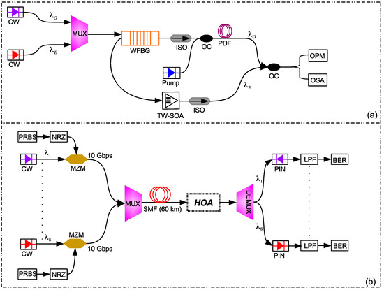 Figure 2a shows the schematic of the proposed design of an HOA for O+E-band amplification based on a parallel combination of a PDFA and an SOA. Figure 2b illustrates the implementation of the proposed HOA in a typical eight-channel CWDM transmission link. The HOA consists of a wavelength division multiplexer (WDM) used to combine the O- and E-band signals, a reflective-type WFBG filter used to separate the O- and E-band wavelengths for amplification, a laser diode pump, and two optical isolators used to block any light reflected back into the system. The O- and E-band wavelengths are combined using a WDM coupler and then applied to the WFBG, whose center wavelength is adjusted to 1310 nm. The WFBG reflects all E-band signals and transmits all O-band signals, as shown in Figure 2. The O-band signal is coupled with a pump laser with a wavelength and power of 1030 nm and 500 mW, respectively, and injected into the PDF. Similarly, the E-band signal is applied to the input of the SOA for amplification. The injection current of the SOA is adjusted such that the gain fluctuation in the E-band is minimum. The injection current used to drive the SOA in this work is 60 mA. The O- and E-band signals are combined after amplification using an optical coupler. A two-port WDM analyzer, an optical power meter (OPM), and an optical spectrum analyzer (OSA) are employed in the simulation for the observation and analysis of the results.