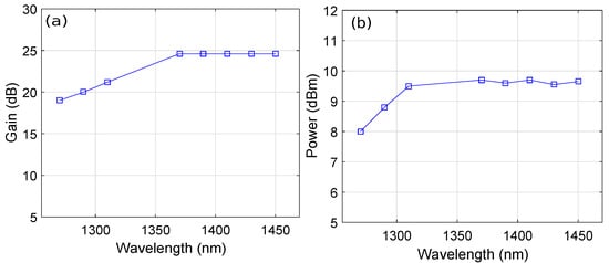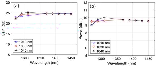 The length of the PDF, doping concentration of Pr, pump wavelength, and injection current were optimized to achieve the optimum performance of the HOA. As mentioned earlier, we used the previously optimized values of the doping concentration of Pr and PDF length [6,27], whereas the pump wavelength and injection current were optimized in this study. Figure 3 shows the plots of the pump wavelength versus the amplifier gain and output power by considering the PDF length, Pr concentration, and SOA injection current of 15.7 m, m, and 60 mA, respectively, at an input signal power of -15 dBm. It is clear from Figure 3a,b that an average gain and output power of around 24 dB and 9.6 dBm were observed, respectively, over a 1270–1450 nm wavelength range covering the O+E-band for a pump wavelength of 1010 nm, 1030 nm, and 1040 nm. It is evident from Figure 3a,b that the flatness in gain and power was best for a pump wavelength of 1030 nm. Therefore, we use a pump wavelength of 1030 nm for the rest of the results.