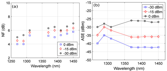 We also plotted the wavelength versus the NF as a function of the signal power, as shown in Figure 6a, considering a PDF length of 15.7 m, Pr concentration of m, pump wavelength of 1030 nm, pump power of 500 mW, and injection current of 60 mA. The results show that the NF was equal to 4 dB, 4.5 dB, and 5 dB at a signal wavelength of 1270 nm for signal powers of 0 dBm, −15 dBm, and −30 dBm, respectively. The NF increased to around 5.3 dB, 5.8 dB, and 6 dB for a signal wavelength of 1410 nm and signal powers of 0 dBm, −15 dBm, and −30 dBm, respectively. Therefore, it is clear that the NF increased when the power of the signal was low. The reason behind this trend is that the optical signal-to-noise ratio (OSNR) was reduced when the signal power was weak, which, in turn, increased the NF of the HOA [6]. We also plotted the signal wavelength versus the ASE as a function of the signal power in Figure 6b by considering a PDF length of 15.7 m, Pr concentration of m, pump wavelength of 1030 nm, pump power of 500 mW, and injection current of 60 mA. It can be observed from the spectral plot in Figure 6b that the average ASEs over a 1270–1450 nm wavelength range were around −39 dBm, −33.7 dBm, and −28 dBm for signal powers of −30 dBm, −15 dBm, and 0 dBm, respectively. Moreover, it is also evident that the ASE increased by increasing the signal power. The reason behind this trend is that by increasing the signal power, the photon population due to spontaneous emission relatively increased, which consequently resulted in an increase in the ASE [6].