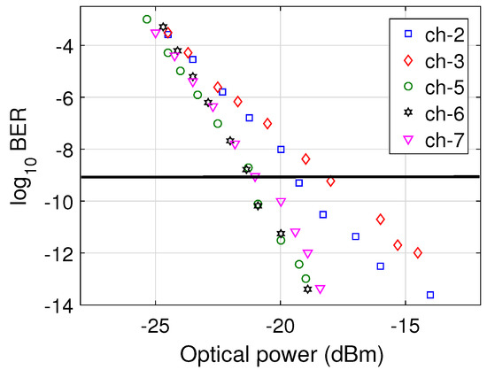 To observe the performance of the proposed O+E-band HOA in a transmission link, we employed it in a CWDM system and measured the BER of the signals transmitted over the link. The BER was computed by observing the statistical distribution of the eye diagrams of the received signals obtained after the low-pass filter (LPF) shown in Figure 2b. The optical power received for each channel at the PIN photodetectors was varied by using optical attenuators to observe the impact on the BER values. The minimum detected optical power necessary to obtain a BER of 10 is called the receiver sensitivity [32]. Figure 7 shows the BER versus the received optical power plots for channels 2, 3, 5, 6, and 7, where each channel had a data rate of 10 Gbps. We have chosen a limited number of channels to make the results easy to visualize. It is clear that the receiver sensitivities of channels 5, 6, and 7 were around −21 dBm, which is the minimum among all the channels, whereas the receiver sensitivity of channel 3 was around −18 dBm, which was the maximum we obtained. The receiver sensitivity of channel 2 was equal to −19 dBm. The reason behind this variation in the receiver sensitivities of the different channels is the variation in the gain for the different signal wavelengths, as shown in Figure 3a.