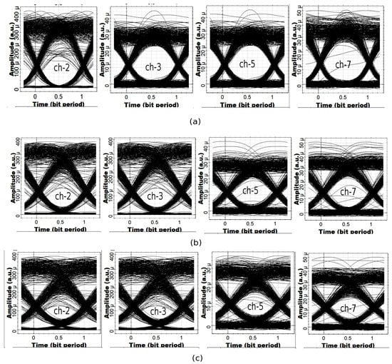 In telecommunication systems, an eye diagram is obtained by overlapping the bit periods of the signal over each other on the oscilloscope to obtain a plot of the signal amplitude with respect to time [33]. Since the shape of the resulting plot is similar to an eye, therefore, the name eye diagram is generally used [33]. Eye diagrams instantly provide visual information to a telecommunication system designer to check the received signal quality and predict the system BER [33]. There are two types of noise that can impact system performance, which are amplitude noise and timing jitter. Therefore, the eye diagram is another important alternative to BER measurements, which readily measure the extent of the amplitude noise and timing jitter in received signals. To further evaluate the performance of the channels, the eye diagrams of channels 2, 3, 5, and 7 were obtained at the output of the LPF by considering data rates of 5 Gbps, 7.5 Gbps, and 10 Gbps, as shown in Figure 8. As the data rate increased, the opening of the eye diagrams of channels 2, 3, 5, and 7 decreased due to the intensity fluctuation, timing jitter, and intersymbol interference (ISI). However, the eye diagrams of the channels had enough openings for the easy detection of ones and zeros [2].