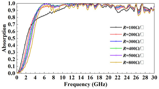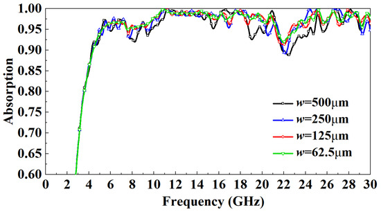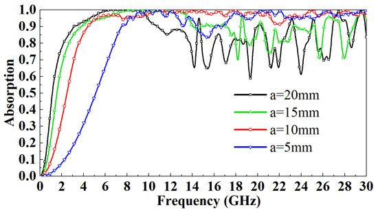 Figure 4 shows the absorptivity distribution of FSR with different sizes in the 0–30 GHz band when electromagnetic waves are incident vertically. It can be observed that when the incident frequency is less than 9 GHz, at the same frequency, with the decrease of