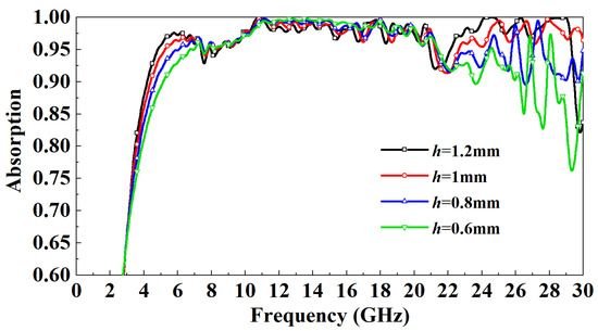 h increases gradually, the absorptivity increases. When the incident frequency is in the 7–22 GHz band, the absorptivity is basically independent of