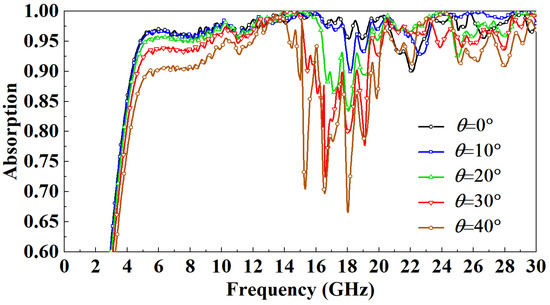 Figure 10 that in the TE mode, with the increase in the incident angle of the electromagnetic wave, the most sensitive band to the incident angle is mainly in the 15–20 GHz band. When the incident angle increases to 20°, this band’s lowest point of absorptivity drop to 85%. When the incident angle increases to 40°, this band’s lowest point of absorptivity drops to 70%. The absorption rate in other bands is highly insensitive to the incident angle, and the absorption rate is above 90%. In TM mode, the direction of the magnetic field is parallel to part of the metal wire. As the incidence angle increases, the metal wire in the absorption cavity will be directly irradiated by the incident wave, thus increasing the utilization rate of the metal wire, so the absorption rate increases. Nevertheless, the incidence angle within a specific range has little influence on the absorption rate. It can be observed from