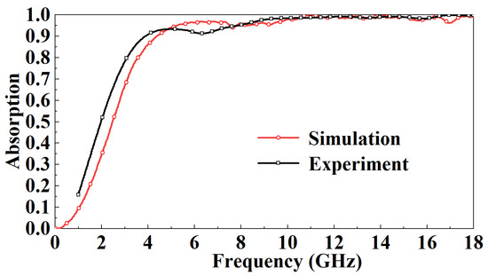 Figure 15 compares simulated and measured results of FSR absorption rates in the TE mode under normal incidence. In the 1–5 GHz band, the absorption rate gradually increases and decreases with the increase of the incident frequency. At the same incident frequency, the absorption rate measured is slightly larger than the simulated results by about 10%. In the 5–8 GHz band, the absorption rate of FSR is basically about 90%, which is slightly smaller than the simulated results. In the 8–18 GHz band, FSR’s absorption rate is above 95%, consistent with the simulated results.