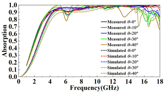 Figure 16 compares the measured results of different incident angles in TE mode and the simulated results. It can be observed that with the increase in the incident angle of electromagnetic waves, the most sensitive bands to the incident angle are mainly in the 4.5–7 GHz band and the 13–18 GHz band. In these two bands, the absorptivity decreases roughly gradually with the increase of the incident angle. In the 4.5–7 GHz band, the fluctuation of the absorption rate is relatively small. When the incident angle increases to 40°, the lowest point of the absorption rate drops to around 77%. In the 13–18 GHz band, the absorptivity fluctuates wildly. When the incident angle increases to 20°, this band’s lowest point of absorptivity drop to around 83%. When the incident angle increases to 40°, this band’s lowest point of absorptivity drop to around 66%. Furthermore, absorptivity in other bands is less sensitive to the incident angle.