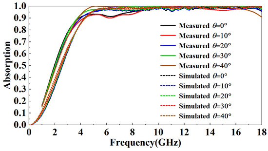 Figure 17 compares the measured results of different incident angles in the TM mode and the simulated results. It can be observed that with the increase in the incident angle of electromagnetic waves, the absorption rate of FSR changed little, and the measured results are consistent with the simulation results.