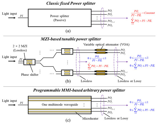 Schematic of the (a) classic fixed power splitter, (b) MZI-based tunable power splitter integrated with variable optical attenuators (VOAs), and (c) programmable MMI-based arbitrary power splitter. POi, power of the output Port i; PI, power of the input light; PIL, lost power due to device insertion loss in practice.