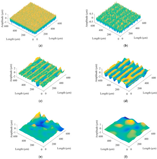 The core of three-dimensional surface roughness characterization is the determination of the reference plane. To achieve this, the main methods include a polynomial fitting method, filtering method, Motif method, and fractal method [10,11,12]. Reference [13] presented a new three-dimensional Motif method for multiscale analysis of surface features and proposed a new three-dimensional model to calculate the statistical parameters for surface features. In ref. [14], the fractal dimension was utilized to quantify the feature separation index in the wavelet transform to obtain the composite features of the engineering surface and verify the effectiveness of the method. In ref. [15], wavelet packet transform was used to separate the surface textures, and the reconstructed roughness and waviness coincided well with the original ones, proving that the extracted textures could better reflect the surface structure. However, the polynomial fitting method obtains the polynomial function according to the principle of least squares as the reference of surface roughness evaluation, the reference plane cannot reflect the existence of the secondary structure, resulting in distortion of the fitting result, so it is not suitable for the evaluation of surface roughness in micromilling. The Motif method uses different thresholds to separate the information about the roughness of surface topography, which lacks technical support and reasonable standards. The fractal method can theoretically use fractal dimensions and length of features to reflect the essential features of surface topography, but the finer the surface structure, the more fractal dimensions are required, and the microgroove surface is small and fine enough, so it is not simple enough. The filtering method separates the signal to extract a filtering reference, mainly including Gaussian filtering and wavelet filtering. Gaussian filtering, however, is only suitable for surface topography obeying normal distribution; the actual engineering surface is complicated, which narrows its scope of application. The wavelet basis restricts the effectiveness of wavelet filtering, and the number of decompositions needs to be determined according to the specific situation, resulting in adverse effects on its development.