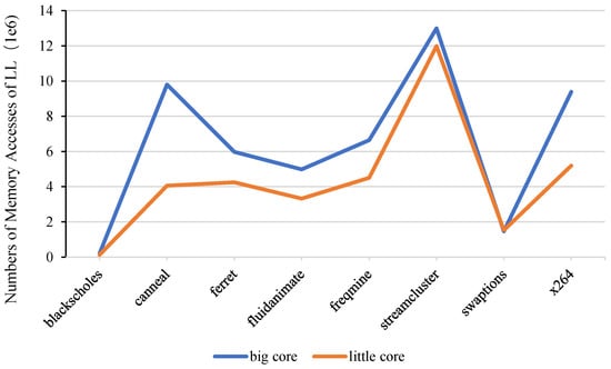 Generally speaking, in the performance asymmetric multi-core architecture, the cores are divided into two types: big cores and little cores. The two types of cores design are positioned differently. The big core has higher performance, and the little core has poor performance but has higher memory access latency tolerance and lower power consumption. This heterogeneous design of high-performance combined with low-power CPU cores can provide high-performance processing capabilities with significantly lower average power consumption, but there are great differences in memory access characteristics between different types of cores. In order to more intuitively show the difference in memory access between big and little cores, we counted the number of LLC accesses of big and little cores when running parsec multithreaded applications, as shown in Figure 1.