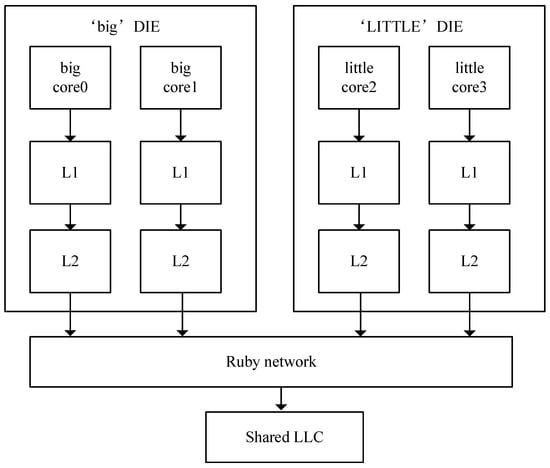 The experiment uses the gem5 simulator [] to simulate the ARM big.LITTLE architecture. We use the gem5 full-system simulator to evaluate the heterogeneity-aware replacement policy for the partitioned cache that we proposed. The Ruby memory subsystem in gem5 implements a detailed simulation model, which provides a variety of replacement policies and consistent protocol implementations. The topology structure is built, and the memory access request is forwarded and processed in the DMA and cache controller configuration. The experiment simulates the DIE model of 2 big cores + 2 little cores as an asymmetric multi-core environment, and uses the full system mode to simulate. Both the big cores and the little cores use the ARM O3 CPU type, and the core microarchitecture configuration is shown in Table 1. Each core has its own L1 cache and L2 cache, and the L3 cache is shared between two DIEs. The overall structure of the system is shown in Figure 3.