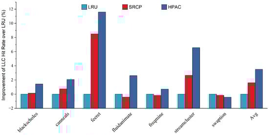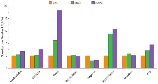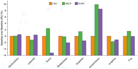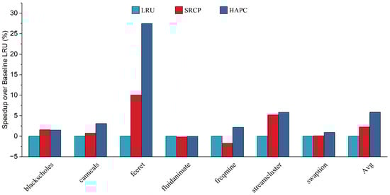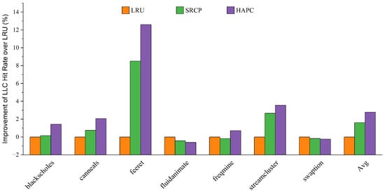 Figure 8 shows the improvement of LLC hit rate over LRU of each replacement policy for parsec sim_medium benchmarks. On average, Figure 8 shows that HAPC achieves an average improvement of LLC hit rate of 3.51%, while SRCP achieves an average improvement of LLC hit rate of 1.61%. These improvements indicate that HAPC is highly modular and shows significant performance benefits on test programs of different scales.