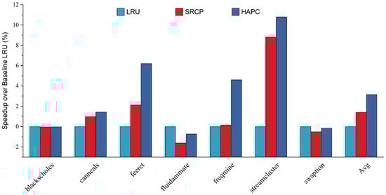 Cache replacement policies mainly use the principle of locality to reduce intra-application interference on single-core systems. Besides traditional replacement policies (such as FIFO, MRU, LFU, and LRU), many high-performance replacement policies have been proposed to apply to shared LLC [,,]. Ref. [] learns from Belady’s optimal solution for past references to predict the caching behavior of future references, but it is not designed for asymmetric multi-core architecture. Those policies consider the workload characteristics of individual applications and dynamically select a policy suitable for each application to reduce the intra-application interference of each application, but the replacement policy cannot fundamentally eliminate the interapplication interference on the shared LLC []. A sharing and reuse-aware partition cache replacement policy [] is proposed to track all accesses to cache blocks in the local core and global check partitions for partition cache maintenance, which can be further used for cache replacement decisions to prevent the eviction of cache blocks shared by multithreaded programs across multiple cores, minimizing intercore interference. Refs. [,] are priority-aware scheduling that propose fine-grained application characterizations to improve the performance (IPC) of prioritized applications executing under shared-resource contention. Those methods focus on minimizing contention on both the main-memory bandwidth and the LLC by monitoring the pressure that each application inflicts on these resources. Ref. [] find that smart cache replacement reduces the burden on software to provide intelligent scheduling decisions. Herein, these priority-aware scheduling and HAPC combined can together improve performance.