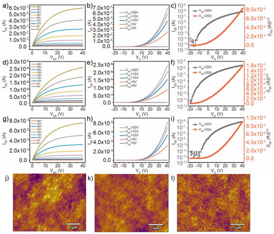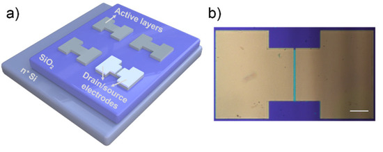 - Yuan, Y.; Giri, G.; Ayzner, A.L.; Zoombelt, A.P.; Mannsfeld, S.C.; Chen, J.; Nordlund, D.; Toney, M.F.; Huang, J.; Bao, Z. Ultra-high mobility transparent organic thin film transistors grown by an off-centre spin-coating method. Nat. Commun. 2014, 5, 3005. [Google Scholar] [CrossRef] [PubMed]