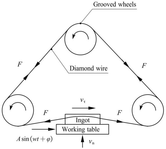 The wire mesh of a multi-wire sawing machine was composed of a diamond wire wound sequentially on grooved wheels, and its cross-section was taken to analyze vibration-assisted diamond wire sawing (Figure 1).