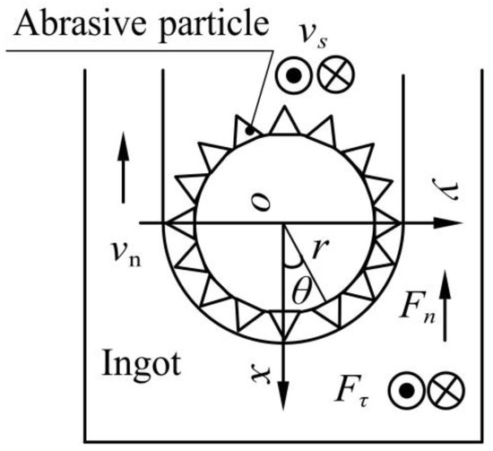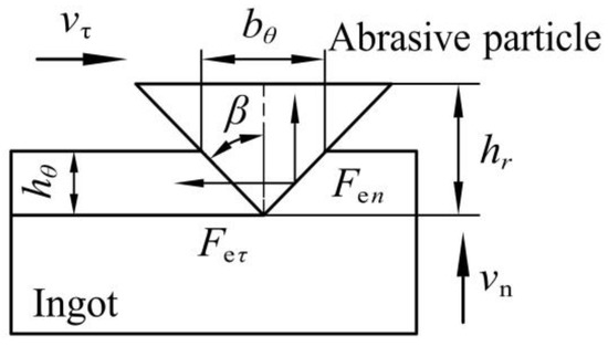 The sawing forces generated by the sawing ingot are mainly composed of the chip deformation force and friction force. By analyzing the theoretical principle of chip deformation and the tribological theory, the sawing forces F e n and F e τ are determined [14]: