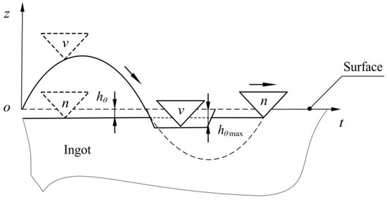 As is shown in Figure 5, when vibration is applied, the trajectory of the abrasive particles changes, the abrasive grains contact the workpiece intermittently, and the trajectory of the abrasive particles approximates a sine curve. Since the feed speed is much smaller than the vibration speed, it can be calculated that the time it takes for abrasive particles to participate in sawing within one vibration period is T / 4 , where T is a single vibration period.