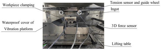 As shown in Figure 6, the vibration-assisted sawing experiment was carried out on a DX-2260 multi-wire sawing machine tool with a vibration-assisted platform. The ingot was fixed to the platform, and the lifting table exhibited a top–down feed movement. The diamond wire saw was wound on the grooved wheels, the retracting wheels, and the guide wheels of the machine tool. Diamond wire sawing was achieved through the feed movement of the lifting platform and the reciprocating motion of the wire saw.