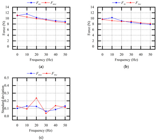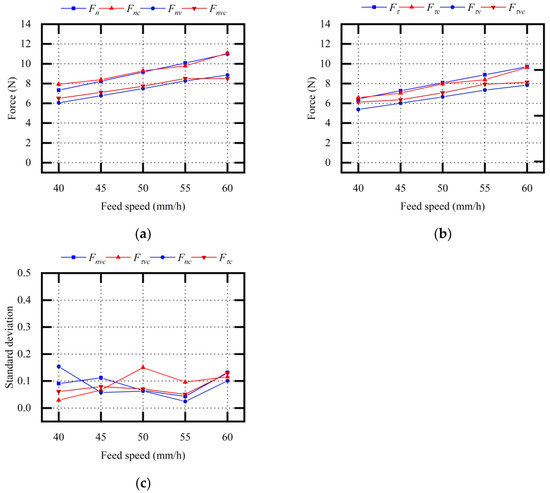 Figure 8. Comparative analysis of sawing forces (variable f ): (a) normal sawing force; (b) tangential sawing force; (c) standard deviation σ1 of experimental values.