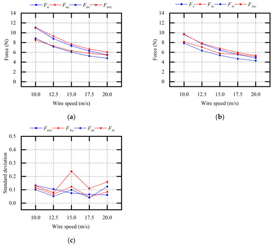 Figure 9. Comparative analysis of sawing force (variable v τ ): (a) normal sawing force; (b) tangential sawing force; (c) standard deviation σ1 of experimental values.