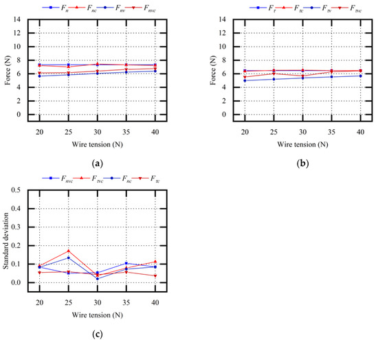 Figure 11. Comparative analysis of sawing force (variable F ): (a) normal sawing force; (b) tangential sawing force; (c) standard deviation σ1 of experimental values.