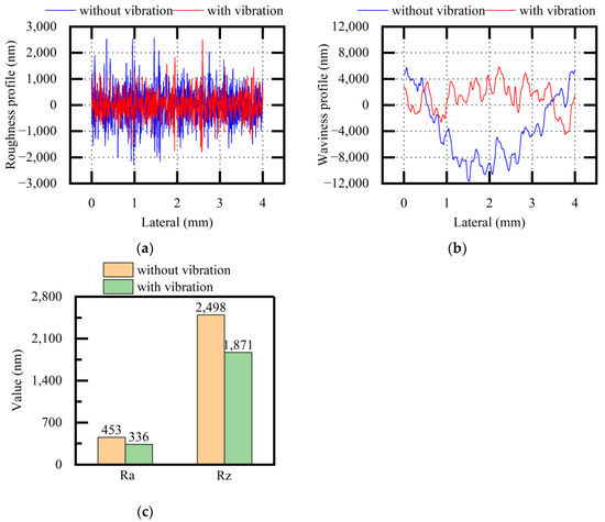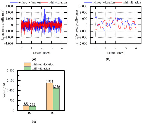 The experiments were carried out according to the method described in Table 3. We obtained the roughness profiles, the waviness profiles, and the Ra and Rz values corresponding to the scanning position of the slices and explored the influence of vibration assistance on surface quality.