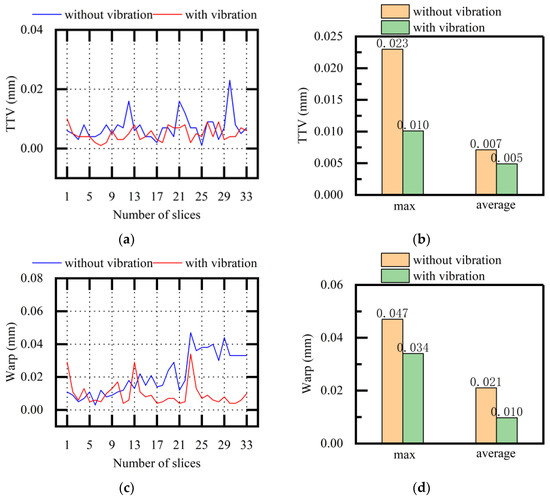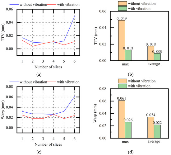Figure 16. Comparative analysis of TTV and warp (SiC, variable f ): (a) TTV of each slice; (b) maximum and average TTV; (c) warp of each slice; (d) maximum and average warp.