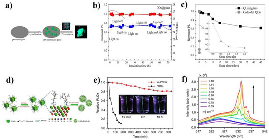 In order to improve the stability of CsPbBr3 QDs, an accelerated transformation process from Cs4PbBr6 to defect-free CsPbBr3 QD was explored by Yang et al. [71]. In this work, the Cs4PbBr6 NCs were first synthesized by the hot injection method. Next, the deionized water was directly injected into a Cs4PbBr6 solution and irradiated under 365 nm light for 20 min. After being re-dispersed in toluene, the ultrahigh photo-and water-stable CsPbBr3 were obtained. It should be noted that the emission intensity could keep 92% after exposing them to 125 mL water for 45 days and could keep 93% when immersed in water and exposed to 365 nm illumination for 540 min. The observed lasing threshold was approximately 254 mJ/cm2, and the lasing could keep stable for more than 8.6 × 107 excitation cycles (Figure 1d–f).