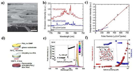 (a) Cross-sectional SEM image of the perovskite network. (b) Emission spectra are collected below, near, and above the lasing threshold. (c) Integrated emission intensity as a function of excitation pulse fluence. The lasing threshold is 195 ± 30 μJ/cm2/pulse. The images (a–c) were adapted with permission from Ref. [60]. Copyright 2014 AIP Publishing LLC. (d) Schematic diagram of the perovskite MAPbI3 films prepared in solution processes. (e) PL emission spectra of the fabricated perovskite films, photo-excited at different optical-pumping powers. (f) L-L curve plotted on a log-linear scale and the corresponding linewidths as a function of pumping powers. The images (d–f) were adapted with permission from Ref. [96]. Copyright 2014 AIP Publishing LLC.